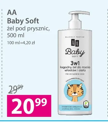 Cena produktu różni się w zależności od wybranego sklepu. Niestety nie posiadamy danych o aktualnych promocjach, jednak wśród archiwalnych ofert 3w1 łagodny żel do mycia włosków i ciała Aa baby soft kosztuje od 20,99 zł do 24,99 zł.