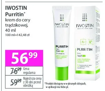 Cena produktu r贸偶ni si臋 w zale偶no艣ci od wybranego sklepu. Niestety nie posiadamy danych o aktualnych promocjach, jednak w艣r贸d archiwalnych ofert Aktywny krem eliminujacy niedoskona艂o艣ci Iwostin purritin kosztuje od 56,99 z艂.