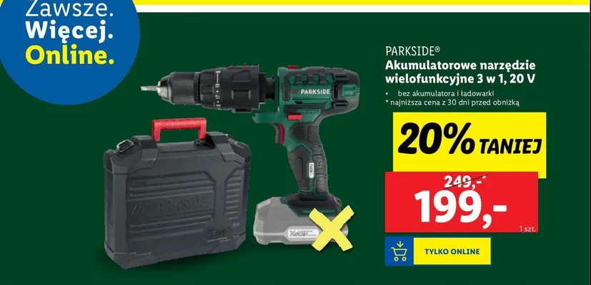Cena produktu r贸偶ni si臋 w zale偶no艣ci od wybranego sklepu. Niestety nie posiadamy danych o aktualnych promocjach, jednak w艣r贸d archiwalnych ofert Akumulatorowe narz臋dzie wielofunkcyjne 20 v Parkside kosztuje od 149 z艂 do 199 z艂.