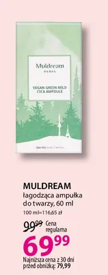 Cena produktu r贸偶ni si臋 w zale偶no艣ci od wybranego sklepu. Niestety nie posiadamy danych o aktualnych promocjach, jednak w艣r贸d archiwalnych ofert Ampu艂ka do twarzy 艂agodz膮ca Muldream kosztuje od 69,99 z艂.
