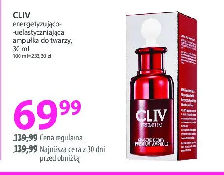 Cena produktu różni się w zależności od wybranego sklepu. Niestety nie posiadamy danych o aktualnych promocjach, jednak wśród archiwalnych ofert Ampułka do twarzy z jagodami żeń-szenia Cliv premium kosztuje od 69,99 zł do 83,99 zł.