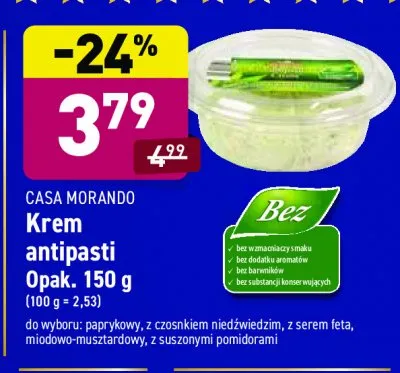 Cena produktu r贸偶ni si臋 w zale偶no艣ci od wybranego sklepu. Niestety nie posiadamy danych o aktualnych promocjach, jednak w艣r贸d archiwalnych ofert Antipasti paprykowe Casa morando kosztuje od 3,59 z艂 do 3,79 z艂.