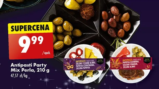 Ile kosztuje Antipasti party mix zielone i czarne oliwki papryka czere艣niowa zielona papryka Perla antipasti?