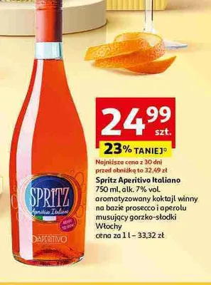 Cena produktu r贸偶ni si臋 w zale偶no艣ci od wybranego sklepu. Niestety nie posiadamy danych o aktualnych promocjach, jednak w艣r贸d archiwalnych ofert Aperitiv Spritz aperitivo italiano kosztuje od 24,99 z艂.