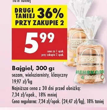 Cena produktu r贸偶ni si臋 w zale偶no艣ci od wybranego sklepu. Niestety nie posiadamy danych o aktualnych promocjach, jednak w艣r贸d archiwalnych ofert Bajgle pszenne Smashed kosztuje od 5,99 z艂 do 7,39 z艂.