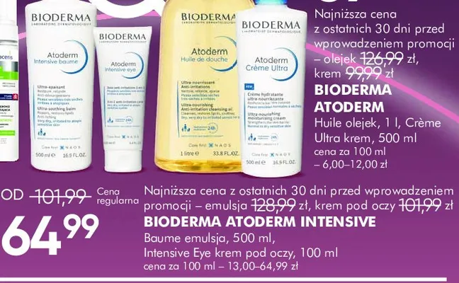 Cena produktu r贸偶ni si臋 w zale偶no艣ci od wybranego sklepu. Niestety nie posiadamy danych o aktualnych promocjach, jednak w艣r贸d archiwalnych ofert Balsam do cia艂a koj膮cy Bioderma atoderm intensive baume kosztuje od 34,99 z艂 do 69,99 z艂.