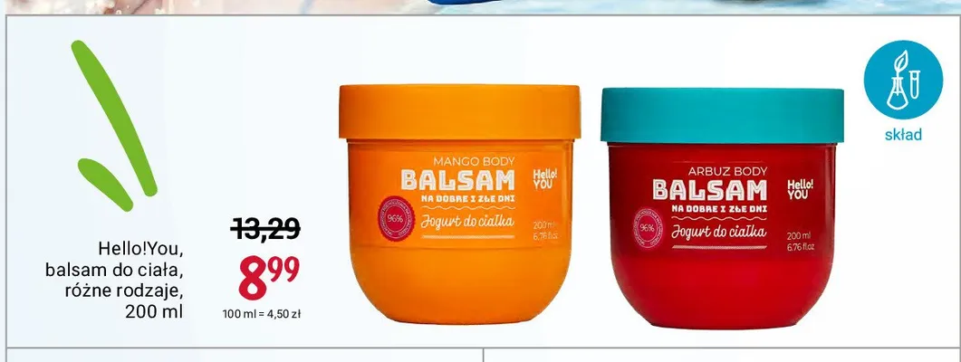 Cena produktu r贸偶ni si臋 w zale偶no艣ci od wybranego sklepu. Niestety nie posiadamy danych o aktualnych promocjach, jednak w艣r贸d archiwalnych ofert Balsam do cia艂a mango HELLO!YOU kosztuje od 8,99 z艂.