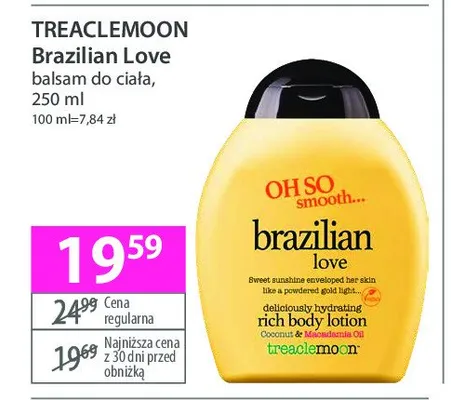Cena produktu r贸偶ni si臋 w zale偶no艣ci od wybranego sklepu. Niestety nie posiadamy danych o aktualnych promocjach, jednak w艣r贸d archiwalnych ofert Balsam do cia艂a Treaclemoon brazilian love kosztuje od 19,59 z艂 do 19,99 z艂.