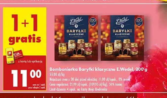 Cena produktu r贸偶ni si臋 w zale偶no艣ci od wybranego sklepu. Niestety nie posiadamy danych o aktualnych promocjach, jednak w艣r贸d archiwalnych ofert Bary艂ki o smaku czekoladowym z nadzieniem alkoholowym E. wedel bary艂ki kosztuje od 11 z艂 do 21,99 z艂.