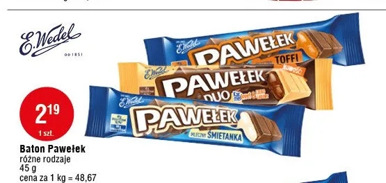 Cena produktu r贸偶ni si臋 w zale偶no艣ci od wybranego sklepu. Niestety nie posiadamy danych o aktualnych promocjach, jednak w艣r贸d archiwalnych ofert Baton duo karmelove & czekoladowe Wedel kosztuje od 1,49 z艂 do 2,15 z艂.