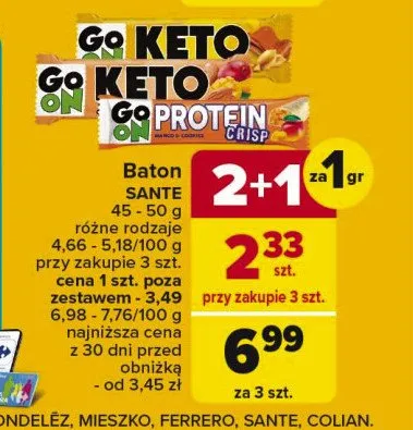 Cena produktu r贸偶ni si臋 w zale偶no艣ci od wybranego sklepu. Niestety nie posiadamy danych o aktualnych promocjach, jednak w艣r贸d archiwalnych ofert Baton keto peanut&carob Go on! kosztuje od 2,33 z艂.