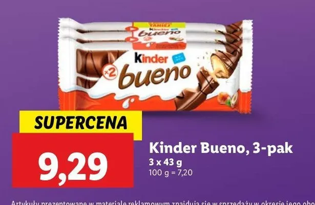 Cena produktu r贸偶ni si臋 w zale偶no艣ci od wybranego sklepu. Produkt Baton Kinder bueno mo偶esz kupi膰 w promocji ju偶 od 2,79 z艂 do 12,29 z艂. Najta艅sza oferta, jak膮 mamy w naszej bazie jest z sieci Makro. Baton Kinder bueno kosztuje aktualnie 2,79 z艂. Zobacz ofert臋