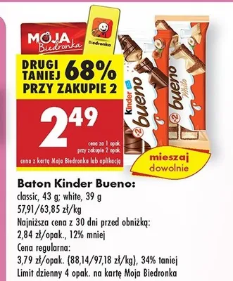 Zastanawiasz si臋, gdzie kupi膰 i ile kosztuje produkt Baton Kinder Bueno white? Regularnie sprawdzamy, czy jest promocja na ten produkt w Biedronka, Lidl, Kaufland, Auchan, Netto, Makro i innych sklepach. Aktualnie posiadamy 1 ofert臋 promocyjn膮 na ten produkt. Ceny zaczynaj膮 si臋 od 2,95z艂!