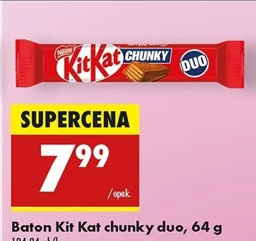 Zastanawiasz si臋, gdzie kupi膰 i ile kosztuje produkt Baton Kitkat chunky? Regularnie sprawdzamy, czy jest promocja na ten produkt w Biedronka, Lidl, Kaufland, Auchan, Netto, Makro i innych sklepach. Aktualnie posiadamy 24 oferty promocyjne na ten produkt. Ceny zaczynaj膮 si臋 od 1,99z艂!