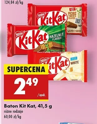 Cena produktu r贸偶ni si臋 w zale偶no艣ci od wybranego sklepu. Produkt Baton KITKAT CHUNKY HAZELNUT mo偶esz kupi膰 w promocji ju偶 od 1,79 z艂 do 2,5 z艂. Najta艅sza oferta, jak膮 mamy w naszej bazie jest z sieci ABC. Baton KITKAT CHUNKY HAZELNUT kosztuje aktualnie 1,79 z艂. Zobacz ofert臋