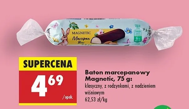 Cena produktu r贸偶ni si臋 w zale偶no艣ci od wybranego sklepu. Produkt Baton marcepanowy Magnetic mo偶esz kupi膰 w promocji ju偶 od 5,99 z艂. Najta艅sza oferta, jak膮 mamy w naszej bazie jest z sieci Biedronka. Baton marcepanowy Magnetic kosztuje aktualnie 5,99 z艂. Zobacz ofert臋