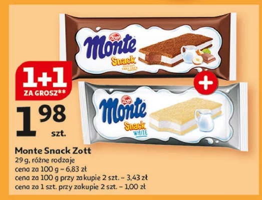 Cena produktu r贸偶ni si臋 w zale偶no艣ci od wybranego sklepu. Niestety nie posiadamy danych o aktualnych promocjach, jednak w艣r贸d archiwalnych ofert Baton mleczny white Zott monte snack kosztuje od 0,95 z艂 do 1,27 z艂.
