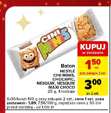 Cena produktu r贸偶ni si臋 w zale偶no艣ci od wybranego sklepu. Niestety nie posiadamy danych o aktualnych promocjach, jednak w艣r贸d archiwalnych ofert Baton Nesquik maxi choco kosztuje od 0,99 z艂 do 1,59 z艂.