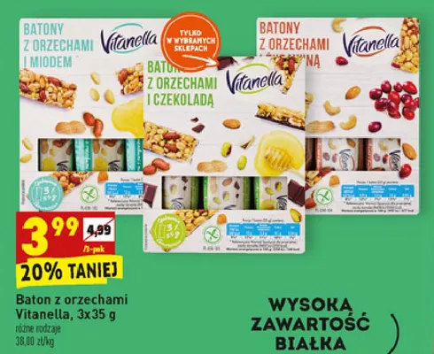 Cena produktu r贸偶ni si臋 w zale偶no艣ci od wybranego sklepu. Niestety nie posiadamy danych o aktualnych promocjach, jednak w艣r贸d archiwalnych ofert Baton orzech i mi贸d Vitanella kosztuje od 3,99 z艂.