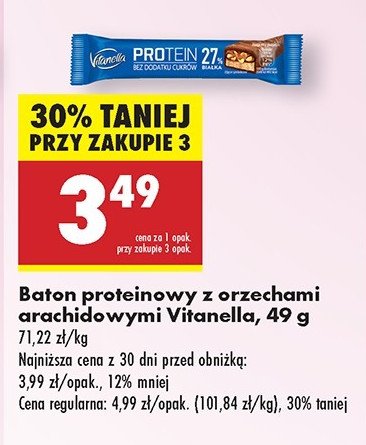 Cena produktu r贸偶ni si臋 w zale偶no艣ci od wybranego sklepu. Niestety nie posiadamy danych o aktualnych promocjach, jednak w艣r贸d archiwalnych ofert Baton proteinowy Vitanella kosztuje od 3,33 z艂 do 3,99 z艂.