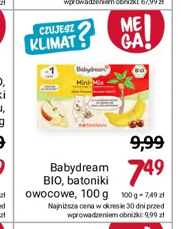Cena produktu r贸偶ni si臋 w zale偶no艣ci od wybranego sklepu. Niestety nie posiadamy danych o aktualnych promocjach, jednak w艣r贸d archiwalnych ofert Batoniki owocowe jab艂ko-banan Babydream kosztuje od 7,49 z艂.