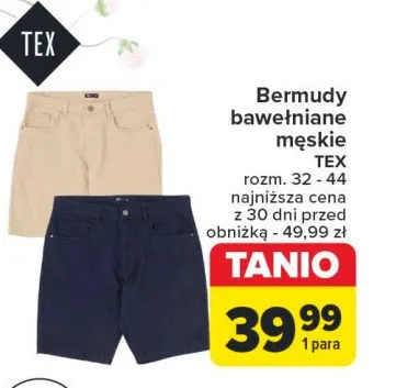 Cena produktu r贸偶ni si臋 w zale偶no艣ci od wybranego sklepu. Niestety nie posiadamy danych o aktualnych promocjach, jednak w艣r贸d archiwalnych ofert Bermudy m臋skie rozm. 32-44 Tex kosztuje od 39,99 z艂.