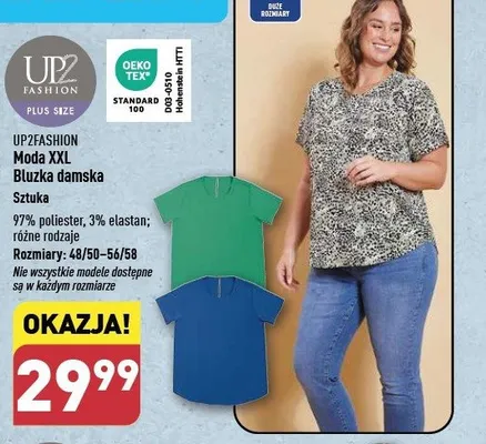 Cena produktu r贸偶ni si臋 w zale偶no艣ci od wybranego sklepu. Produkt Bluzka damska xxl Up2fashion mo偶esz kupi膰 w promocji ju偶 od 29,99 z艂. Najta艅sza oferta, jak膮 mamy w naszej bazie jest z sieci Aldi. Bluzka damska xxl Up2fashion kosztuje aktualnie 29,99 z艂. Zobacz ofert臋