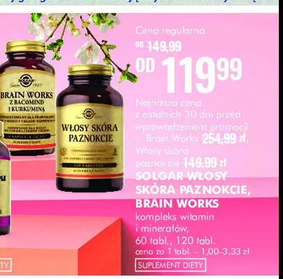 Cena produktu r贸偶ni si臋 w zale偶no艣ci od wybranego sklepu. Niestety nie posiadamy danych o aktualnych promocjach, jednak w艣r贸d archiwalnych ofert Brain works z bacomind i kurkum膮 SOLGAR kosztuje od 119,99 z艂.