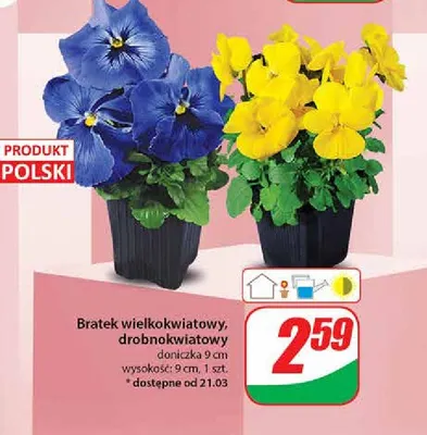 Zastanawiasz si臋, gdzie kupi膰 i ile kosztuje produkt Bratek drobnokwiatowy? Regularnie sprawdzamy, czy jest promocja na ten produkt w Biedronka, Lidl, Kaufland, Auchan, Netto, Makro i innych sklepach. Aktualnie nie posiadamy ofert promocyjnych na ten produkt.