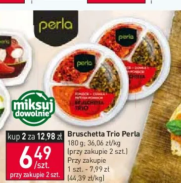 Cena produktu r贸偶ni si臋 w zale偶no艣ci od wybranego sklepu. Niestety nie posiadamy danych o aktualnych promocjach, jednak w艣r贸d archiwalnych ofert Bruschetta trio oliwkowa + paprykowo-pomidorowa + pomidorowa Perla kosztuje od 5,99 z艂 do 6,49 z艂.