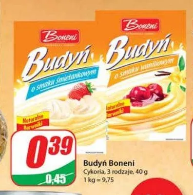 Cena produktu r贸偶ni si臋 w zale偶no艣ci od wybranego sklepu. Niestety nie posiadamy danych o aktualnych promocjach, jednak w艣r贸d archiwalnych ofert Budy艅 waniliowy Boneni kosztuje od 0,35 z艂 do 0,39 z艂.