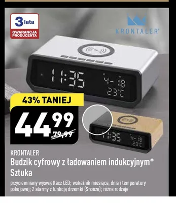 Cena produktu r贸偶ni si臋 w zale偶no艣ci od wybranego sklepu. Niestety nie posiadamy danych o aktualnych promocjach, jednak w艣r贸d archiwalnych ofert Budzik cyfrowy z 艂adowaniem indukcyjnym srebrny Krontaler kosztuje od 44,99 z艂 do 89 z艂.