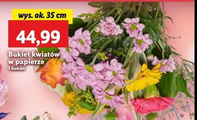 Zastanawiasz si臋, gdzie kupi膰 i ile kosztuje produkt Bukiet kwiat贸w 35 cm? Regularnie sprawdzamy, czy jest promocja na ten produkt w Biedronka, Lidl, Kaufland, Auchan, Netto, Makro i innych sklepach. Aktualnie nie posiadamy ofert promocyjnych na ten produkt.