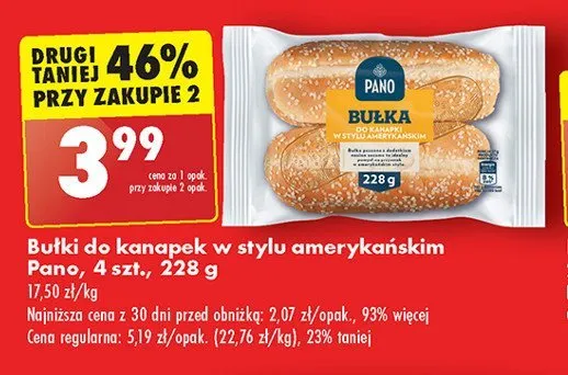 Cena produktu r贸偶ni si臋 w zale偶no艣ci od wybranego sklepu. Niestety nie posiadamy danych o aktualnych promocjach, jednak w艣r贸d archiwalnych ofert Bu艂ka do kanapek w stylu ameryka艅skim Pano kosztuje od 2,99 z艂 do 3,99 z艂.