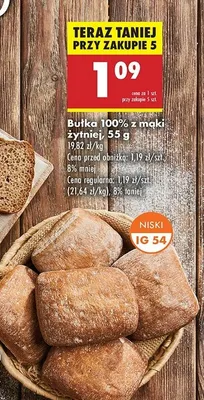 Zastanawiasz się, gdzie kupić i ile kosztuje produkt Bułka z mąki żytniej? Regularnie sprawdzamy, czy jest promocja na ten produkt w Biedronka, Lidl, Kaufland, Auchan, Netto, Makro i innych sklepach. Aktualnie posiadamy 1 ofertę promocyjną na ten produkt. Ceny zaczynają się od 1,19zł!