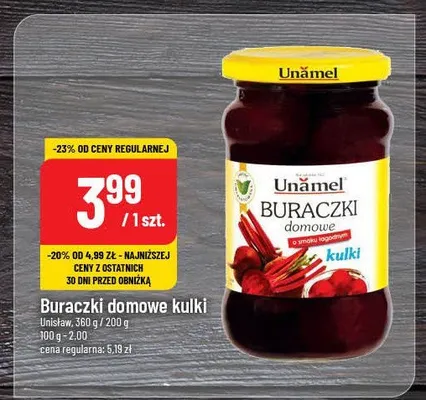 Cena produktu r贸偶ni si臋 w zale偶no艣ci od wybranego sklepu. Niestety nie posiadamy danych o aktualnych promocjach, jednak w艣r贸d archiwalnych ofert Buraczki domowe kulki UNAMEL kosztuje od 3,99 z艂 do 4,99 z艂.
