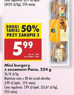 Cena produktu r贸偶ni si臋 w zale偶no艣ci od wybranego sklepu. Niestety nie posiadamy danych o aktualnych promocjach, jednak w艣r贸d archiwalnych ofert Burgery mini z sezamem Pano kosztuje od 5,99 z艂.