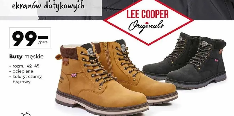 Cena produktu r贸偶ni si臋 w zale偶no艣ci od wybranego sklepu. Produkt Buty m臋skie 42-45 Lee cooper mo偶esz kupi膰 w promocji ju偶 od 69,9 z艂 do 257,07 z艂. Najta艅sza oferta, jak膮 mamy w naszej bazie jest z sieci Biedronka. Buty m臋skie 42-45 Lee cooper kosztuje aktualnie 69,9 z艂. Zobacz ofert臋