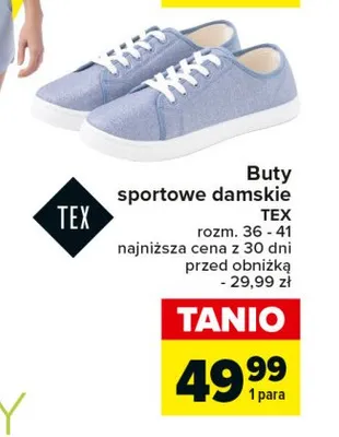 Cena produktu r贸偶ni si臋 w zale偶no艣ci od wybranego sklepu. Produkt Buty sportowe damskie 36-41 Tex mo偶esz kupi膰 w promocji ju偶 od 49,99 z艂. Najta艅sza oferta, jak膮 mamy w naszej bazie jest z sieci Leclerc. Buty sportowe damskie 36-41 Tex kosztuje aktualnie 49,99 z艂. Zobacz ofert臋