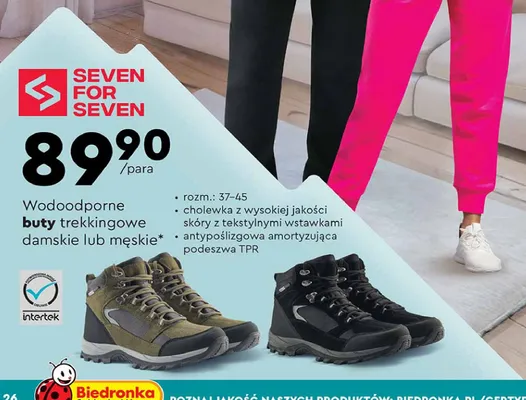 Cena produktu r贸偶ni si臋 w zale偶no艣ci od wybranego sklepu. Produkt Buty trekkingowe m臋skie 38-45 Seven for 7 mo偶esz kupi膰 w promocji ju偶 od 79,9 z艂. Najta艅sza oferta, jak膮 mamy w naszej bazie jest z sieci Biedronka. Buty trekkingowe m臋skie 38-45 Seven for 7 kosztuje aktualnie 79,9 z艂. Zobacz ofert臋