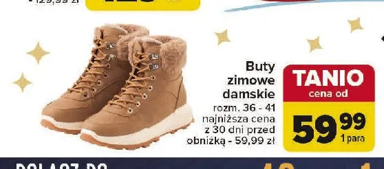 Cena produktu r贸偶ni si臋 w zale偶no艣ci od wybranego sklepu. Produkt Buty zimowe damskie rozm. 36-41 mo偶esz kupi膰 w promocji ju偶 od 29,99 z艂. Najta艅sza oferta, jak膮 mamy w naszej bazie jest z sieci Leclerc. Buty zimowe damskie rozm. 36-41 kosztuje aktualnie 29,99 z艂. Zobacz ofert臋