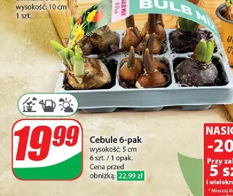 Zastanawiasz si臋, gdzie kupi膰 i ile kosztuje produkt Cebule hiacynt + narcyz + tulipan? Regularnie sprawdzamy, czy jest promocja na ten produkt w Biedronka, Lidl, Kaufland, Auchan, Netto, Makro i innych sklepach. Aktualnie nie posiadamy ofert promocyjnych na ten produkt.