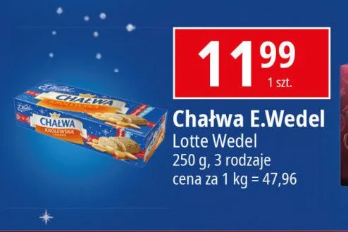 Zastanawiasz si臋, gdzie kupi膰 i ile kosztuje produkt Cha艂wa kr贸lewska z orzechami E.WEDEL? Regularnie sprawdzamy, czy jest promocja na ten produkt w Biedronka, Lidl, Kaufland, Auchan, Netto, Makro i innych sklepach. Aktualnie posiadamy 1 ofert臋 promocyjn膮 na ten produkt. Ceny zaczynaj膮 si臋 od 2,99z艂!
