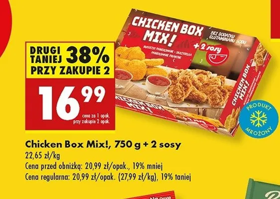 Cena produktu r贸偶ni si臋 w zale偶no艣ci od wybranego sklepu. Niestety nie posiadamy danych o aktualnych promocjach, jednak w艣r贸d archiwalnych ofert Chicken box + 2 sosy kosztuje od 14,99 z艂 do 16,99 z艂.