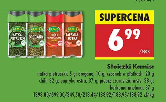 Cena produktu r贸偶ni si臋 w zale偶no艣ci od wybranego sklepu. Niestety nie posiadamy danych o aktualnych promocjach, jednak w艣r贸d archiwalnych ofert Chili pieprz cayenne Kamis kosztuje od 1,49 z艂 do 6,99 z艂.