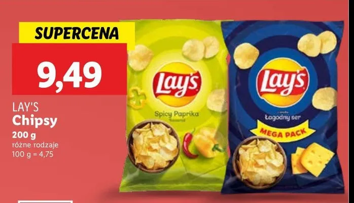 Cena produktu r贸偶ni si臋 w zale偶no艣ci od wybranego sklepu. Produkt Chipsy 艂agodny ser Lay's mo偶esz kupi膰 w promocji ju偶 od 9,49 z艂. Najta艅sza oferta, jak膮 mamy w naszej bazie jest z sieci Biedronka. Chipsy 艂agodny ser Lay's kosztuje aktualnie 9,49 z艂. Zobacz ofert臋