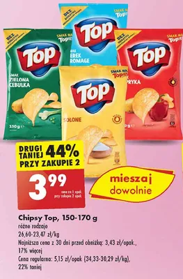 Cena produktu r贸偶ni si臋 w zale偶no艣ci od wybranego sklepu. Niestety nie posiadamy danych o aktualnych promocjach, jednak w艣r贸d archiwalnych ofert Chipsy o smaku serka fromage Top chips (biedronka) kosztuje od 3,99 z艂 do 4,99 z艂.