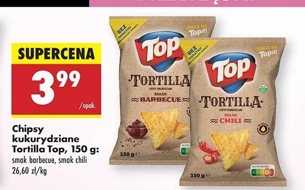 Cena produktu r贸偶ni si臋 w zale偶no艣ci od wybranego sklepu. Niestety nie posiadamy danych o aktualnych promocjach, jednak w艣r贸d archiwalnych ofert Chipsy tortilla o smaku barbecue Top chips Top (biedronka) kosztuje od 3,99 z艂.