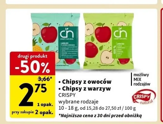Cena produktu r贸偶ni si臋 w zale偶no艣ci od wybranego sklepu. Niestety nie posiadamy danych o aktualnych promocjach, jednak w艣r贸d archiwalnych ofert Chipsy z jab艂ka Crispy natural kosztuje od 2 z艂 do 2,79 z艂.