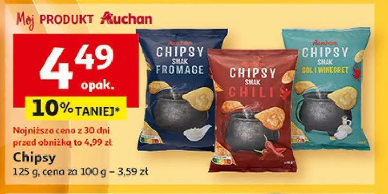 Ile kosztuje Chipsy z sol膮 i vinegret Auchan r贸偶norodne (logo czerwone)?